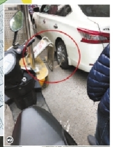 图② 因为停车费纠纷而被锁的业主车辆。图为戴上“脚链”(图中红圈处)的私家车。