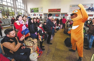 昨日,“大城小爱”爱心公益团体的志愿者们在余姚火车站为回乡的外来务工人员表演节目。当日,余姚市“大城小爱”爱心公益团体的志愿者们来到余姚火车站,为提前回乡过年的外来务工人员提供网上购票、搬运行李、赠送水果矿泉水等服务,让乘车回乡的外来务工人员踏上温暖回家路。新华社记者徐昱 摄