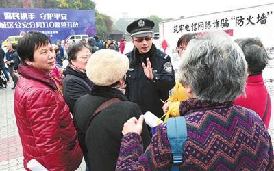 昨天,是与报警电话“110”谐音的一个日子。当日上午,在杭州吴山广场上举行的警民携手守护平安活动现场,警方重点向广大退休职工普及预防并识破形形色色的电信诈骗的常识,呼吁退休的大妈、大伯,不管接到怎样“逼真”的电话,一定要守住自己银行卡(本)的密码、验证码,第一时间拨打110电话求证。所有要你转账、汇款到“安全账户”,要求配合公检法调查、证实清白;家人意外受伤,急需救命钱;买房购车退税等种种由头的电话,都是骗人的。记者周金友 摄影报道