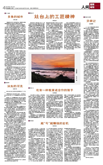 最难忘的是炎热的夏天,那时没有空调,暑气逼人,最好的去处便是泡在河水里。儿时的我胆小怕水,两只手紧紧抓住塑料面盆,只能在河流的最窄处小心翼翼地扑腾几下,一个人用双手捧起水,再一滴滴地看着它从我的手指缝里滴落下来。我的小伙伴不一样,他们在河流的最宽处扎猛子、抓鱼虾、摸螺蛳,每次我都看得胆战心惊,他们是我儿时的英雄。那是属于我的最美时光。