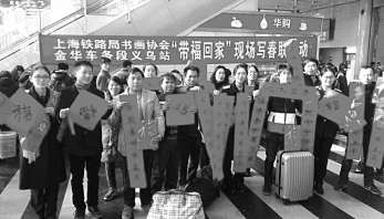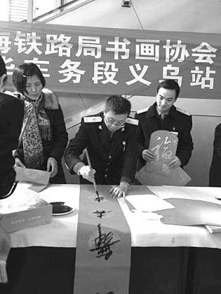 义乌市铁路枢纽管委会在车站小广场搭建了许多临时棚供旅客躲雨就座。义乌市四季风志愿大队为旅客免费提供姜茶,这是他们连续第十年到义乌站免费提供服务。预计第一天发送旅客3.5万人。车站还组织邀请浙江钱江书画院、上海铁路局书画协会的书法家现场写春联,为旅客送去200副春联和200个福字,营造了浓浓的春节喜庆气氛。斯多林