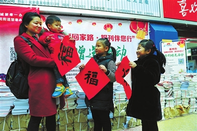 | ▲春运开始,衢州市总工会开展为回家过春节的民工书写春联和赠送书籍活动。这项活动已连续开展3年,共为外地民工送书刊18万余册,免费书写春联2600余幅。 图为近日贵州省毕节市一位民工带着孩子准备回家过年,在车站候车室收到了工会送上的报刊和福字。 毛朝阳 摄 |
