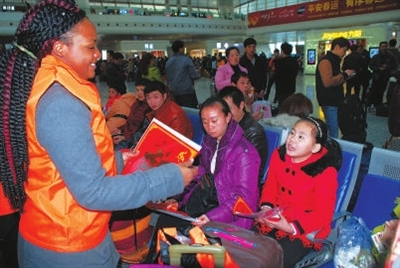 | 春节在即,福字和对联受到回家旅客的喜爱。日前,在杭州火车东站,来自加拿大、英国等地的中外友人志愿者俱乐部的志愿者把福字送到旅客手上。记者羊荣江 通讯员马翔 摄 |