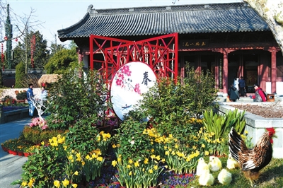 昨天下午,在杭州西子湖畔钱王祠公园内,西湖迎春花展掀起了“红盖头”,园中锦鸡造型惟妙惟肖,鲜花万紫千红,不少中外游客闻讯赶来或赏花,或取景,分享2017年第一波春天的气息。