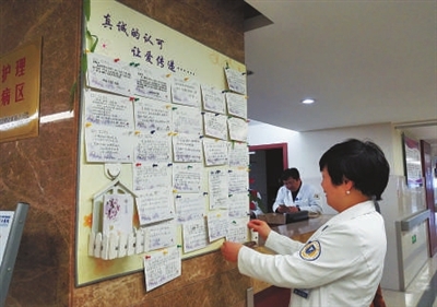3号楼15楼泌尿外科病区护士长周小波一边整理卡片,一边告诉记者:“卡片很多,一个多星期就贴满了。我们有护士定期整理,每月科室例会上都会拿出来分享。这对我们医护人员也是一种激励,我们会争取做得更好。”