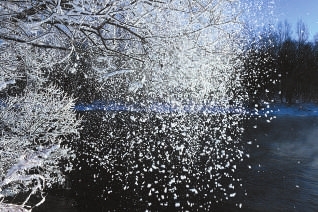河的上游有电站,因此河水常年不冻,当气温极度寒冷时,河水便化作雾气飘渺,沿河的树木也就披上白亮的新装了。尤其早上河水流淌,雾气蒙蒙,等太阳登场时雾凇神奇变成橘红色,游人仿佛来到仙境,如同梦中游,游中梦。玉树琼花,毛茸茸的雪花挂满枝条,到了中午12点才渐渐簌簌下落,长时间地挂在树上,为伊春大平台增添了无穷魅力,这真可谓,雾凇冬季俏伊春。
