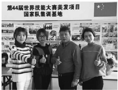 | 国家队美发项目“五强”前三选手 石丹(右一)、王芹(左一)、沈文青(左二)和教练吉正龙(右二)合影 |
