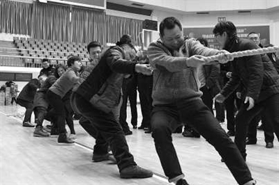 图为常山县公路管理局的工作人员在参加拔河比赛。