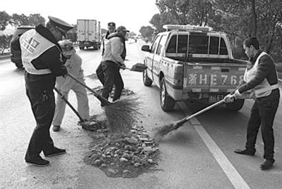 据悉,春运期间龙游公路局每天都有百余名路政及养护人员坚守在保洁、保畅一线,维护着道路的安全与畅通。图为路政、养护人员正在清除泄漏在路面的砂石料。胡跃文 摄