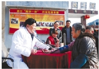 2月7日,建德市乾潭镇陵上新村梅塘医疗站医生吴光潮,在村口为村民提供测量血压、讲解安全用药常识、养生保健等义诊服务。