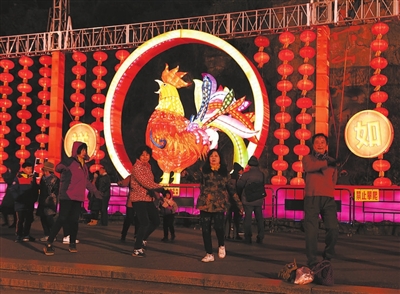昨晚6时30分,杭城吴山广场上约8米高的元宵节“花灯墙”亮灯了,正中的雄鸡彩灯精气神十足,寓意美好,引得不少中外游人驻足观赏、合影。杭州大妈们更是欣喜地跳起了欢乐的广场舞助兴。当晚是农历正月十三,传统的“上灯节”。