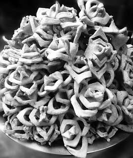 薯花做好后,一字排开放入竹匾里,拿到暖阳下晾晒,至少需要晒三五天。晒干后分批放入油锅中炸酥,这是制作薯花的最后一道环节。炸薯花的火候要掌握好,不能太大也不能太小;油也很有讲究,据说使用当地产的山茶油,炸出来的味道和颜色最好。