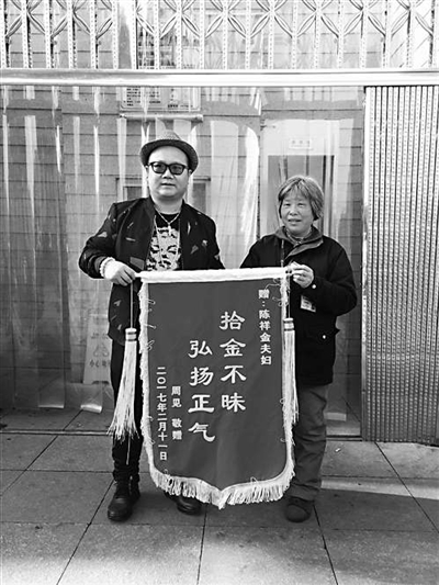 通讯员姚苗苗、何文斌报道 “派出所民警太热心了,还有那对捡到包后主动报警送还的环卫夫妇,真的得好好感谢一下他们。”日前,台州市椒江区的周先生分别将两面锦旗送到台州市公安局开发区分局区西派出所和椒江区环卫处市民广场东公厕。周先生失而复得的,是放有财物价值上百万元的一只包,而拾金不昧的陈祥金和叶桂兰夫妇,是在市民广场东公厕上班的两位环卫工人。