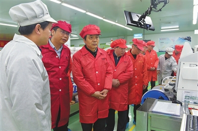 | 穿上防静电服,厉志海一行在闻泰通讯股份有限公司SMT(表面贴装技术)车间调研。张加健 摄 |