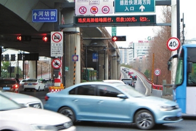 昨天,杭州中河高架望江路入口上方电子显示屏,不停地显示高架闯限处罚的升级版规定。从2月20日起,杭州错峰限行正式升级,在高架道路快速路违反错峰限行规定,将依据机动车违反禁令标志的规定,罚款100元,记3分。交警已在杭州各条高架快速路匝道口安装禁令标志。