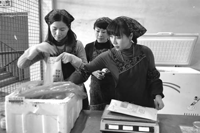 | 陈丹艳(右一)与员工们一起包装产品。 |