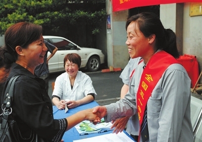 | 虞纯(右)经常参加志愿为民服务活动,倾听大家的声音,充实自己的建议。记者周金友 摄 |