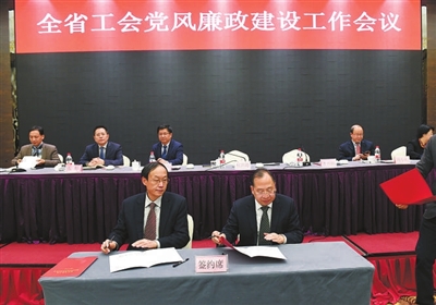 | 省总工会党组书记、常务副主席杜世源(右)与分管领导签订责任书。记者周金友 摄 |