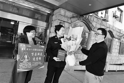 图为全省最美警察、爱民模范、衢州市五一劳动奖章获得者龙游县交警伍红慧收到“三八”节的特殊礼物——一束鲜花。