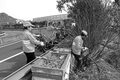 为凸显常山慢城新形象,近日,常山县公路管理局养护人员来到常山高速公路出口绿化带匝道上,对影响公路视线的绿化植物进行修剪。