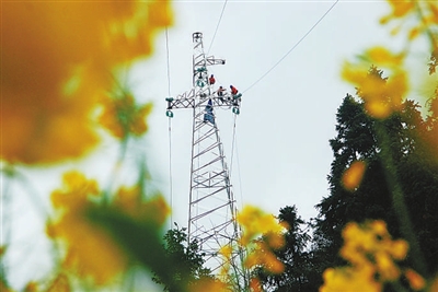 昨日,在建德市更楼街道新市村境内,几名电力工人正在一处高压铁塔上搭建塔身,拉起线路。他们在高空中一左一右,或上或下忙碌操作的身影,在田野里一片金黄色的油菜花映衬下,如同春天里奏起一曲流动的音符,景致如画,美不胜收。