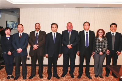 | 厉志海(左四)与客人亲切合影。 记者周金友 摄 |