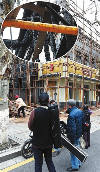 昨天下午,几位背着二胡的民乐爱好者,准备去位于杭州解放路官巷口的一家琴行“聚聚、会会”,不曾想这里已经遭遇火灾。只能站在警戒线外,透过脚手架的空隙,看着已被烧成木炭的房梁,连呼可惜。