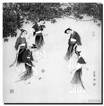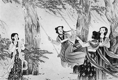 那时,女子们不光出外观赏风景,还参加一些游乐活动,如拔河、荡秋千、蹴鞠等。杜甫的“千里秋千习俗同”,宋代欧阳修的“绿杨楼外出秋千”,黄庭坚“穿花蹴踏秋千索”,写的都是古代千金小姐们荡秋千时的胜景。