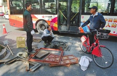 昨天上午,杭州江城路上,一位骑红色公共自行车的退休工人对赶来抢修破裂地下电缆管井盖的师傅们说,“我发现这个隐患就打电话‘报告’了”。他说,这里是公交车出站必经之路,要是轮胎压住破裂的铁盖后“反弹”出去,不管是砸着车辆,还是行人,后果都很严重。这位退休工人还指着已经掀开的井盖说,井盖的“基坑”没按规范施工,是井盖常被压裂的原因之一。