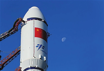 海南文昌航天发射场橙色的活动发射平台上,长征七号遥二火箭静静矗立,乳白色箭体孔武有力,鲜红国旗图案引人注目。