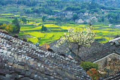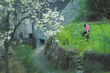 步入“庭院深深深几许”的柏坑前洋古建筑群,农家院子里全是厚石板铺地,家家翘角的屋檐和马头墙、镂花的木门窗、咯吱响的木楼梯……远看村庄,层层叠叠的黑瓦,一树梨花盛放,了无喧哗与尘俗。