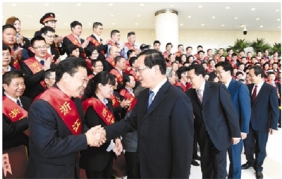 | 车俊、袁家军、陈金彪、厉志海等与劳模先进亲切握手并合影。 |