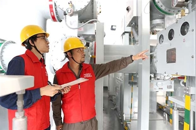 日前,在110千伏北干变电站内,国网杭州市萧山区供电公司党员身穿红马甲,带领现场作业人员紧张有序地开展变电站投产工作。