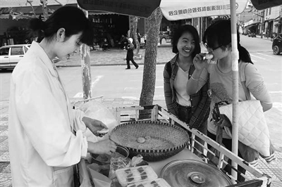 似乎已经习惯了,面对镜头摊主从容地做着手中的活,纤纤玉手翻转间一个个诱人食欲的麻糍就做好了,浅笑地递给顾客:您拿好,慢走。透出几许优雅,仿佛如茶艺般在展示生活的一种闲适。