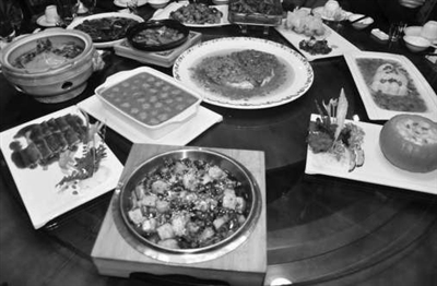 老板说这河舒豆腐衍生的菜肴众多,至今可达200种之多;花样可随意变换,只要客人喜欢什么方法都可以做。这桌上的十余种都是他们店里的特色精品。