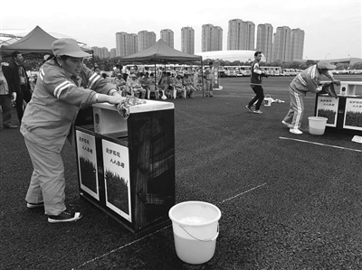 日前,绍兴柯桥区举行“树旗帜、立标杆、争做服务明星”环卫工人劳动技能比武活动,来自城区300多名环卫工人参加果壳箱擦洗、隔离栏擦洗、垃圾分类、外立面保洁等10个岗位技能比武,在技能比赛中秀出身手、亮出绝活。