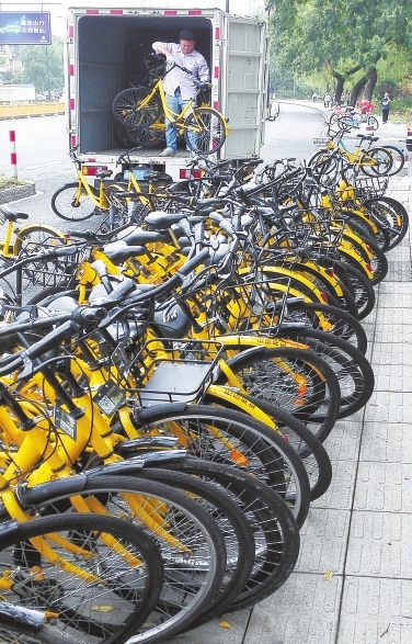 本报讯 记者周金友摄影报道 昨天上午,在杭州余杭塘路教工路口南侧的人行道上,停放着近200辆“受伤”的OFO小黄车。“城市快运”的谢师傅忙着把这些待修的共享单车往大货车上搬。谢师傅语出惊人,所有的车都是人为损坏的,绝大多数是在获取开锁密码后,人为地刮去二维码,将单车占为私车,还有一些是硬生生地把车架、车把、车座、车胎损坏或破坏的。