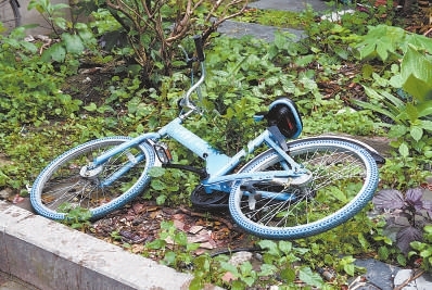 | 昨天早晨,被丢弃在杭州彩霞岭社区路边的一辆“小鸣单车”。 |