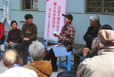 | “鲍大妈聊天室”首席主持人鲍倩(中)到楼道访居民(资料图片) |