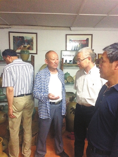 | 陈新华(左二)在向参观者介绍婺州窑。记者羊荣江 摄 |
