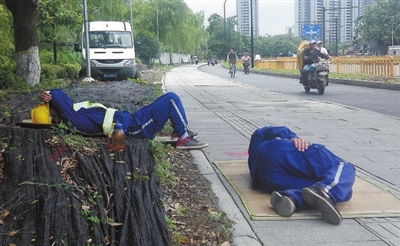 昨天中午,在杭州余杭塘路69号附近的人行道上,2位身穿“隧道股份”工作服的工人师傅席地而卧,有行人看见后关心地提醒,人行道上和绿化带里很潮湿的……一名师傅答道,他们在这条路上施工,中午也没地方去,就躺地上午休一会儿。杭州已经进入夏季,有关部门在抓施工进度的同时,莫忘路面作业工人的身体健康,为他们设一个“爱心休息点”,便于午休。