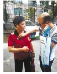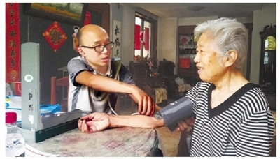 | 在社区遇见一位身体不适签约了的阿姨,胡鸣宇在路边就给她作了检查。记者王艳 摄 |