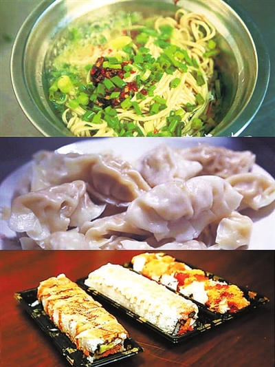 除了食堂饭菜,民警们还能尝到同事、家属自制的各具风味的美食。巡逻民警周焕福的老家在山东,饺子是周嫂的拿手绝活。皮薄馅多,蘸上香醋和辣椒,一口满足。不少同事打趣说,要抢着跟老周一组,能吃上正宗“周嫂水饺”。还有“许姐寿司”、“老王拌面”、民警颜媚为大家做的食饼筒……虽然没有大师水准,却样样让人回味无穷。