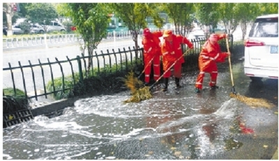 昨天下午,受大雨影响,杭州莫干山路西溪河下路口附近的慢车道出现严重积水,正在路面作业的环卫工人迅速启动防洪排涝应急预案,顶着大雨合力排除路面积水,确保交通安全,过往行人和司机纷纷点赞。当日,全省多地发布暴雨蓝色预警,气象部门提醒,近期雨势增强,谨防地质灾害。