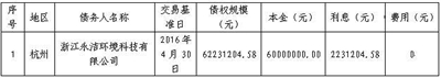 中国华融资产管理股份有限公司拥有浙江永洁环境科技有限公司1笔不良债权,截至交易基准日,债权总额为62231204.58元,债权担保方式为抵押加保证。(具体材料可到中国华融网站www.chamc.com.cn查询)