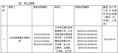 | 中国华融资产管理股份有限公司联系人:邱海舟 联系电话:010-57809340 地址:北京市西城区金融大街8号 胡军忠 联系电话:13867929306 地址:义乌市义亭镇上胡村16组 注:1. 本公告清单列示暂计至2017年3月15日的贷款本金余额,借款人和担保人应支付给胡军忠的利息按借款合同、担保合同及中国人民银行的有关规定计算。 2. 若债务人、担保人因各种原因更名、改制、歇业、吊销营业执照或丧失民事主体资格的,请相关承债主体及/或清算主体代为履行义务或履行清算责任。 3. 清单中“担保人”包括保证人、抵押人、出质人,担保人的担保范围以签署的合同等法律文件约定为准。如公告中债务人、合同编号、债权金额、担保人等信息与事实不符的,以签署的合同等法律文件约定为准。 |