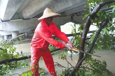 险情发生后,永康市交通公路管理部门为确保国道桥梁的安全,迅速抽调抢排险人员,涉水清障排险。由于当日水流湍急,交叉横卡在桥墩上的两棵大树给清障带来了较大的难度。抢险人员冒着被洪水冲走的危险,先涉水将大树用绳索捆扎好,然后用工程车慢慢地从湍急的洪水中拖至河边,并分段锯断清理。就这样,经过6个多小时的艰难清理,这两棵横卡在桥墩上的大树终被清除。