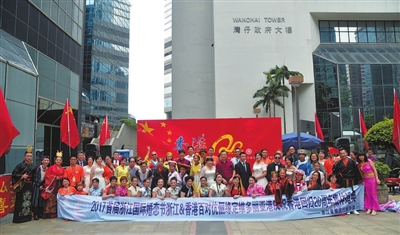本报讯 记者周金友 通讯员俞啸磊摄影报道 7月1日,由浙江省婚庆行业协会牵手广东、深圳、山东、香港、澳门婚庆行业协会,在浙江启示录文化科技有限公司、杭州娃哈哈集团等大力支持下,举办了首届浙江国际婚恋节暨百对伉俪庆祝香港回归20周年集体婚典,婚典在香港湾仔政府大楼前喜庆开场(上图)。百对伉俪和浙江婚庆艺术团的演员们,向香港市民和来自世界各地的嘉宾友人,表演并展示了汉式婚俗礼仪和旗袍秀等,香港教育工作者联会等为他们颁发了庆祝香港回归20周年集体婚典纪念章。