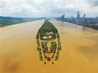 这是洪水淹没下的长沙橘子洲,目前整个景区已经对外封闭(7月3日摄)。