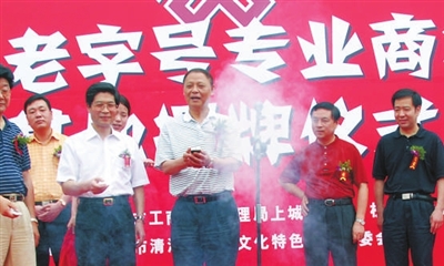 2007年5月23日,浙江省及全国首个老字号专业商标品牌基地的揭牌仪式,在杭州清河坊历史文化街区举行,冯根生摁下揭牌的“开关”。 (资料照片)记者周金友 摄
